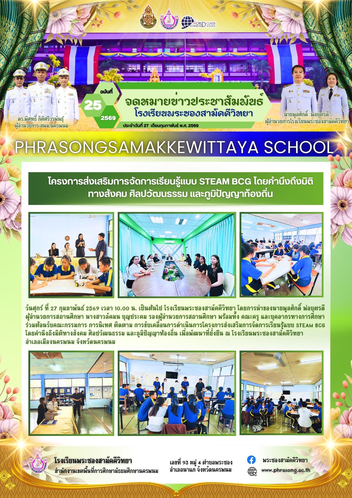 วันศุกร์ ที่ 27 กุมภาพันธ์ 2569 เวลา 10.00 น. เป็นต้นไป โรงเรียนพระซองสามัคคีวิทยา โดยการนำของนายพูลศักดิ์ พ่อบุตรดีผู้อำนวยการสถานศึกษา นางสาวภัคมน บุญประคม รองผู้อำนวยการสถานศึกษา พร้อมทั้ง คณะครู และบุคลากรทางการศึกษา ร่วมต้อนรับคณะกรรมการ การนิเทศ ติดตาม การขับเคลื่อนการดำเนินการโครงการส่งเสริมการจัดการเรียนรู้แบบ STEAM BCG โดยคำนึงถึงมิติทางสังคม ศิลปวัฒนธรรม และภูมิปัญญาท้องถิ่น เพื่อพัฒนาที่ยั่งยืน ณ โรงเรียนพระซองสามัคคีวิทยา อำเภอเมืองนครพนม จังหวัดนครพนม