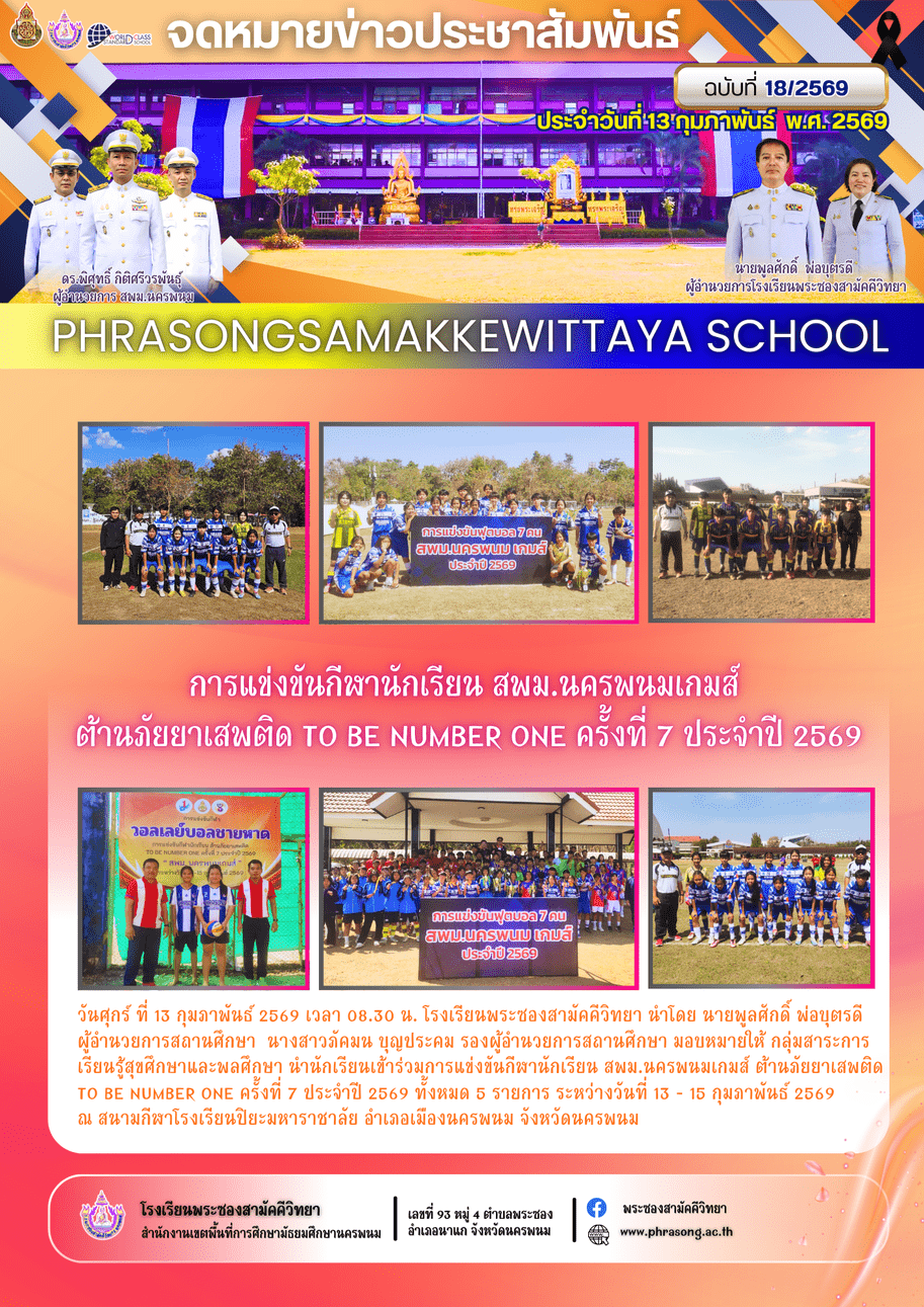 วันศุกร์ ที่ 13 กุมภาพันธ์ 2569 เวลา 08.30 น. โรงเรียนพระซองสามัคคีวิทยา นำโดย นายพูลศักดิ์ พ่อบุตรดี ผู้อำนวยการสถานศึกษา นางสาวภัคมน บุญประคม รองผู้อำนวยการสถานศึกษา มอบหมายให้ กลุ่มสาระการเรียนรู้สุขศึกษาและพลศึกษา นำนักเรียนเข้าร่วมการแข่งขันกีฬานักเรียน สพม.นครพนมเกมส์ ต้านภัยยาเสพติด TO BE NUMBER ONE ครั้งที่ 7 ประจำปี 2569 ทั้งหมด 5 รายการ ระหว่างวันที่ 13 - 15 กุมภาพันธ์ 2569 ณ สนามกีฬาโรงเรียนปิยะมหาราชาลัย อำเภอเมืองนครพนม จังหวัดนครพนม