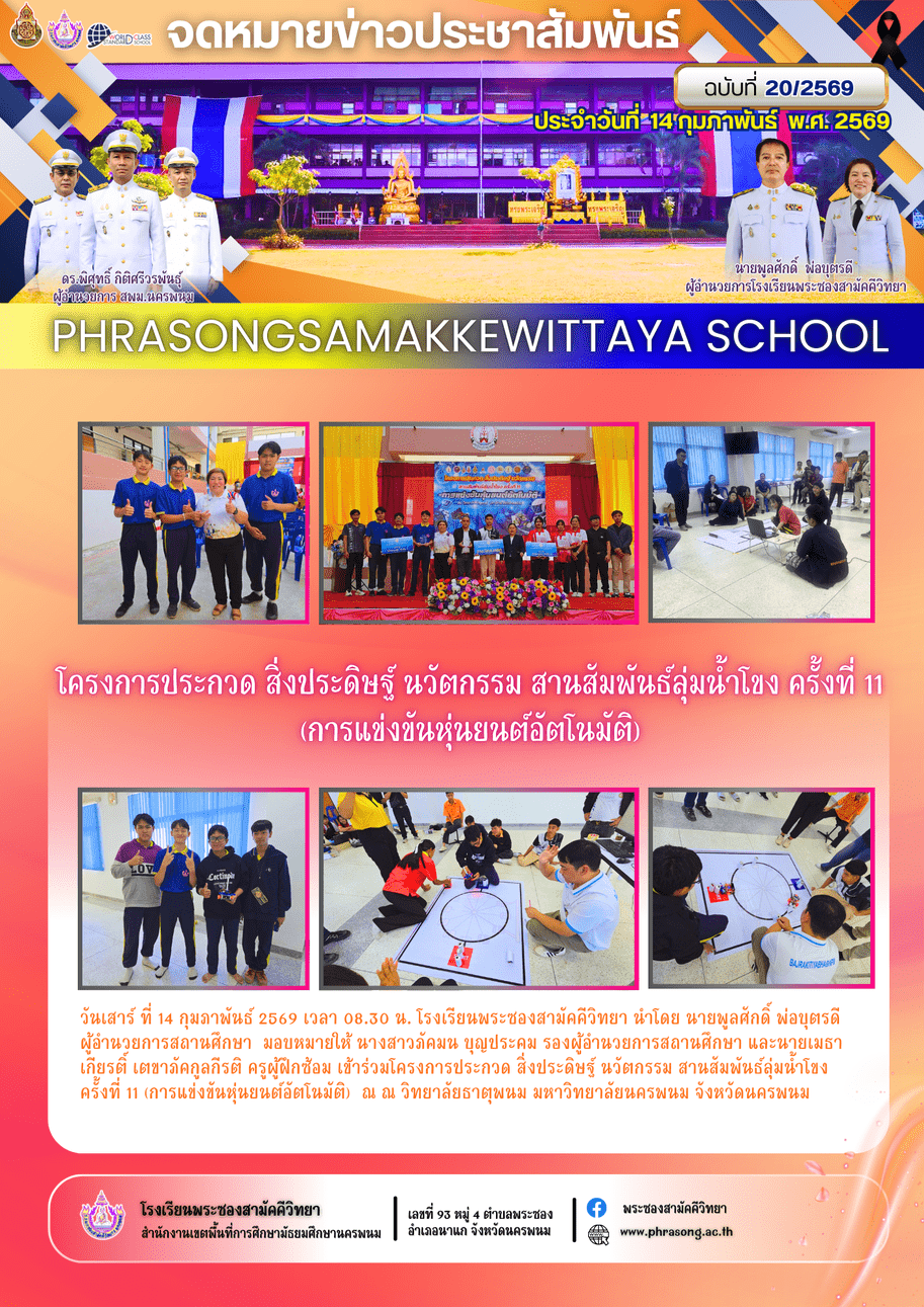 วันเสาร์ ที่ 14 กุมภาพันธ์ 2569 เวลา 08.30 น. โรงเรียนพระซองสามัคคีวิทยา นำโดย นายพูลศักดิ์ พ่อบุตรดี ผู้อำนวยการสถานศึกษา มอบหมายให้ นางสาวภัคมน บุญประคม รองผู้อำนวยการสถานศึกษา และนายเมธาเกียรติ์ เตขาภัคกูลกีรติ ครูผู้ฝึกซ้อม เข้าร่วมโครงการประกวด สิ่งประดิษฐ์ นวัตกรรม สานสัมพันธ์ลุ่มน้ำโขง ครั้งที่ 11 (การแข่งขันหุ่นยนต์อัตโนมัติ) ณ ณ วิทยาลัยธาตุพนม มหาวิทยาลัยนครพนม จังหวัดนครพนม